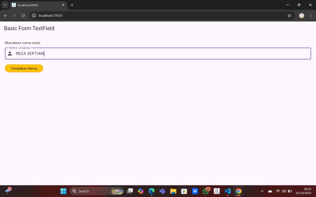 TextField adalah widget Flutter untuk menerima input teks sederhana, misalnya nama atau alamat. Pada Praktikum kali ini kita Membuat form sederhana dengan TextField dan tombol untuk menampilkan input via SnackBar