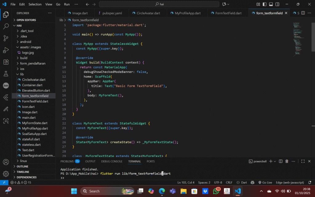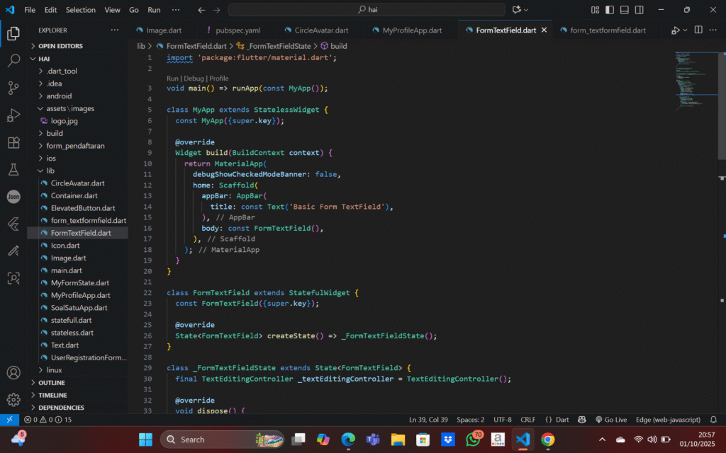 Adalah versi lanjutan dari TextField yang mendukung valiidasi input. Dengan cara menambahkan validator, aplikasi dapat memeriksa apakah data yang kita masukkan sudah sesuai aturan, misalnya email mengandung simbol “@” atau password minimal 6 karakter. Membuat form dengan menggunakan TextFormField yang mendukung validasi input (seperti format email).