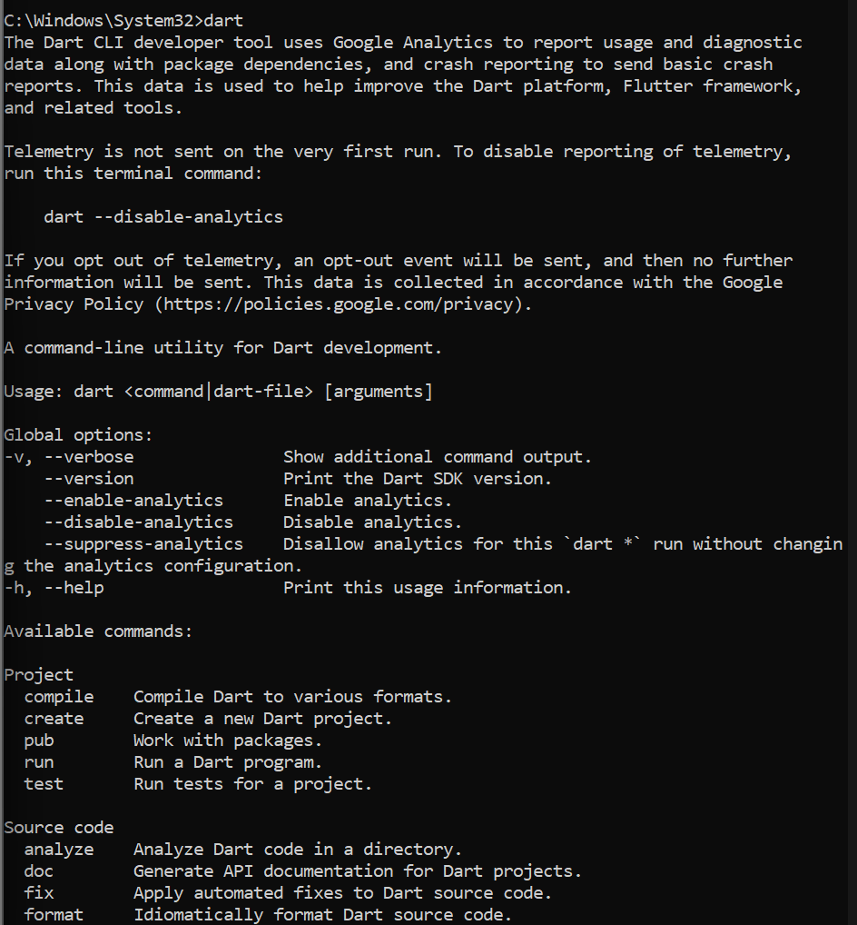 Tanpa SDK, perintah dart tidak akan bisa dijalankan di terminal.