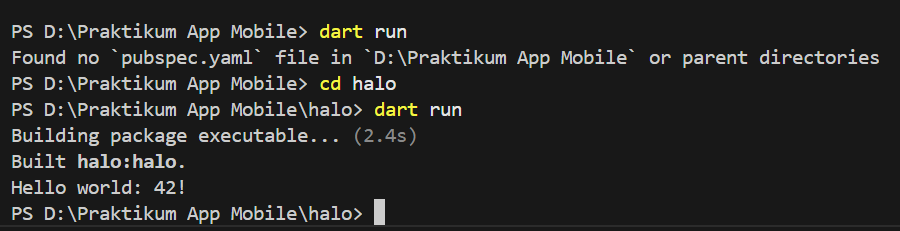 setelah itu lanjutkan kedalam terminal vs code untuk menjalankan program dengan menggunakan kode cd halo dan dart run