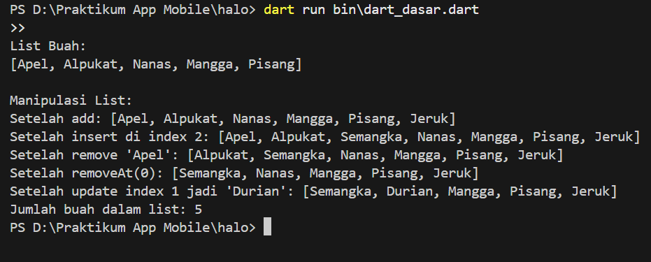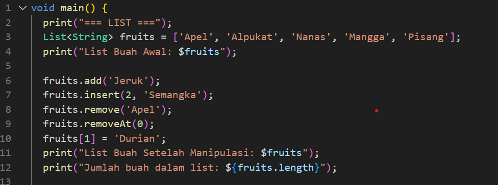 Selanjutnya adalah membuat List dalam bahasa pemrograman Dart. Untuk membuat list yaitu: