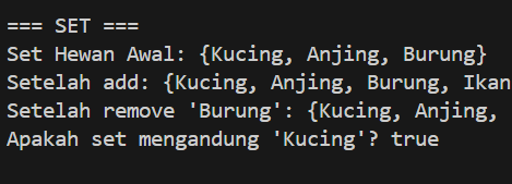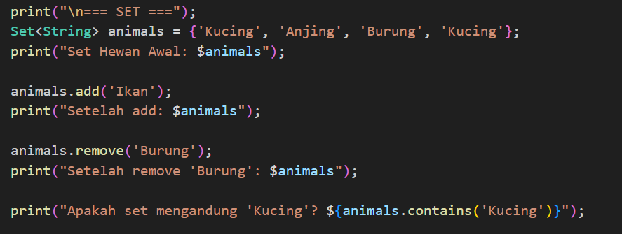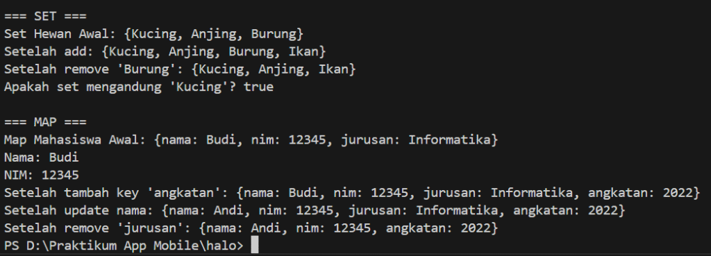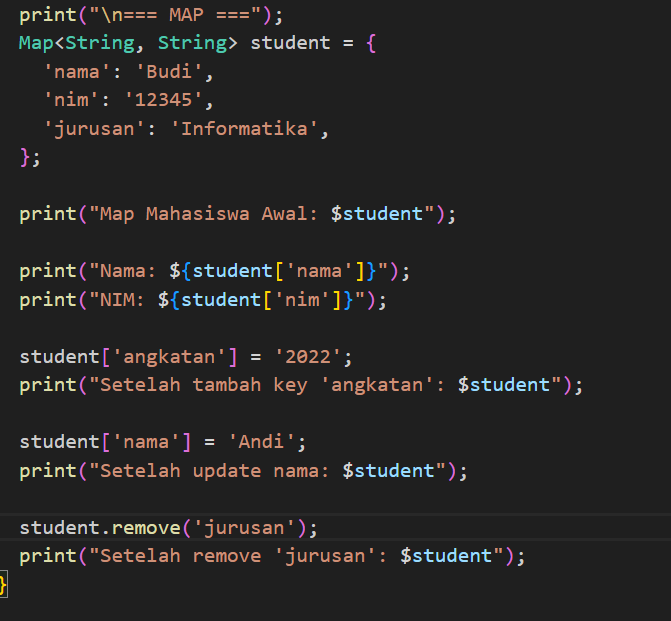 Selanjutnya Map. Map dalam bahasa Dart adalah struktur data yang menyimpan pasangan key dan value. Setiap data di dalam Map diakses menggunakan key, bukan berdasarkan urutan seperti pada List. Key dalam Map harus unik, sedangkan value bisa sama atau berbeda. Dengan konsep ini, Map sangat berguna ketika kita ingin menyimpan data yang berhubungan, misalnya data mahasiswa dengan key berupa “nama”, “nim”, dan “jurusan”.