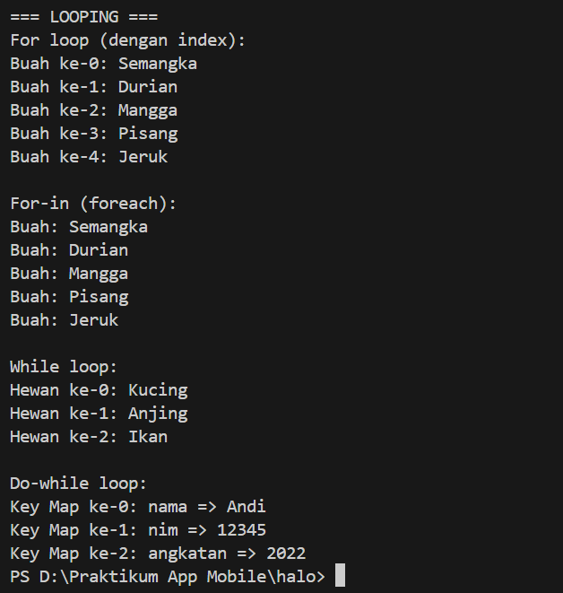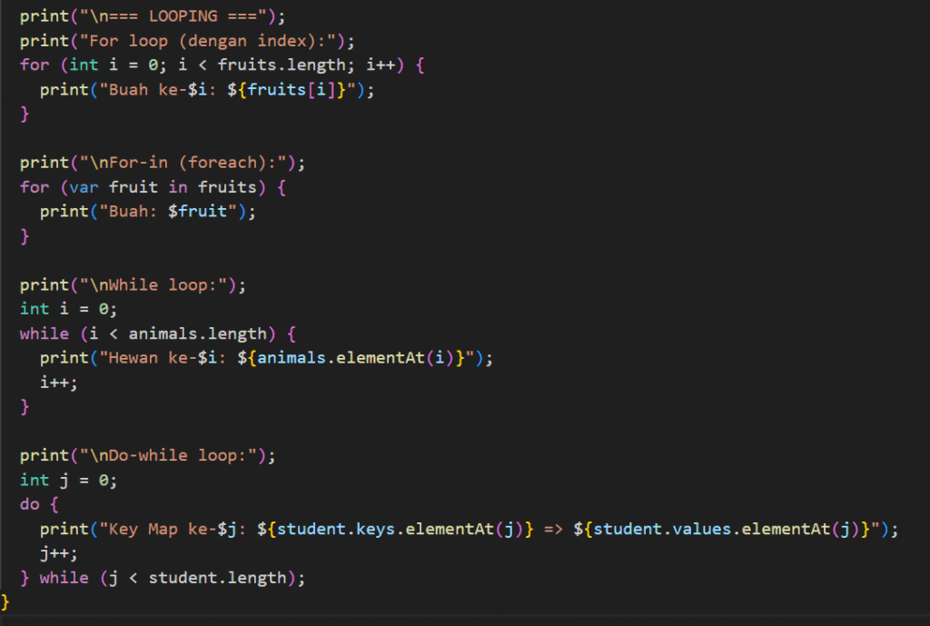 Selanjutnya, kita akan masuk ke perulangan pada Dart. Ada dua cara perulangan dalam dart, yaitu: