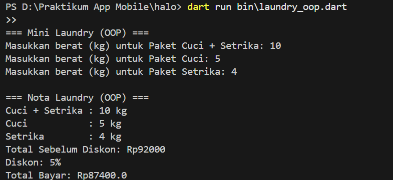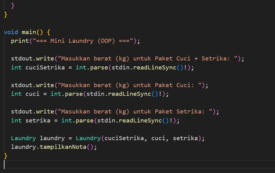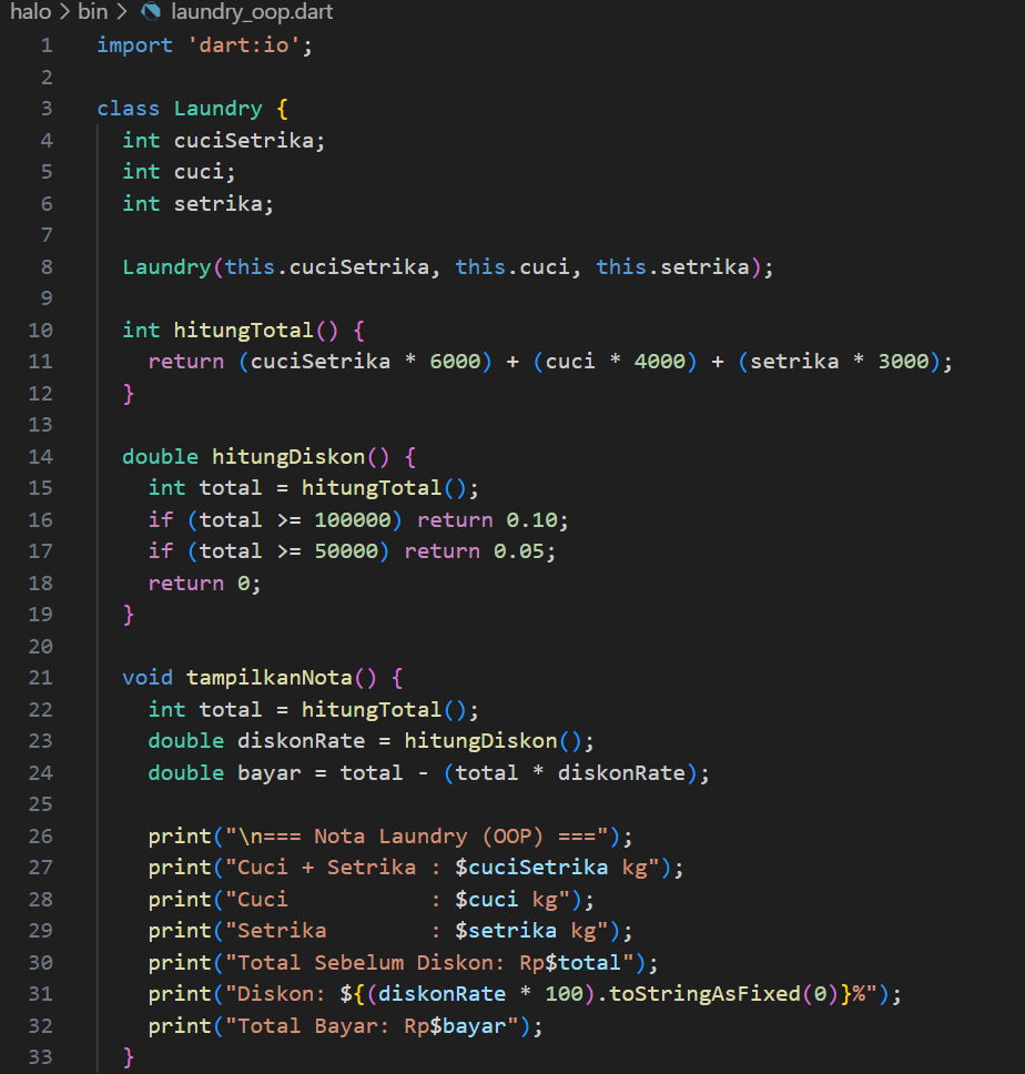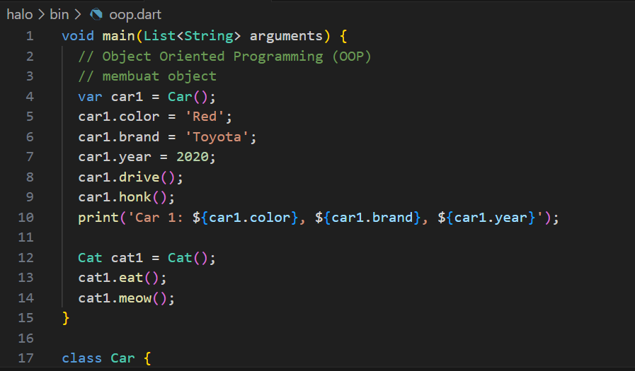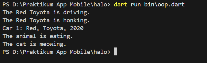 Selanjutnya, Object-Oriented Programming dalam bahasa pemrograman Dart. Buatkan kode berikut agar lebih memahami bagaimana OOP di Dart berkerja: