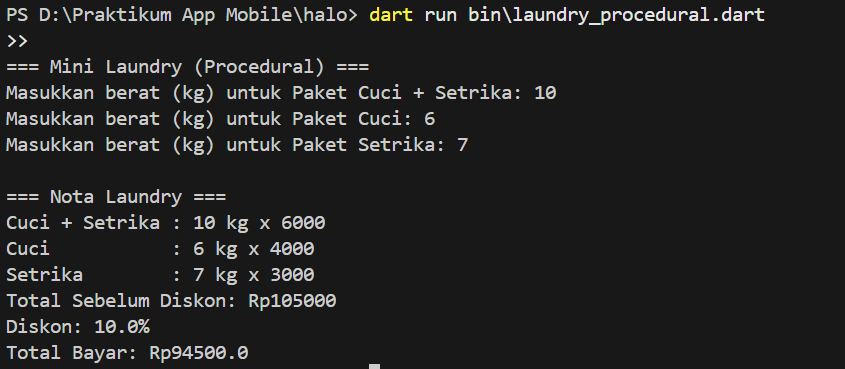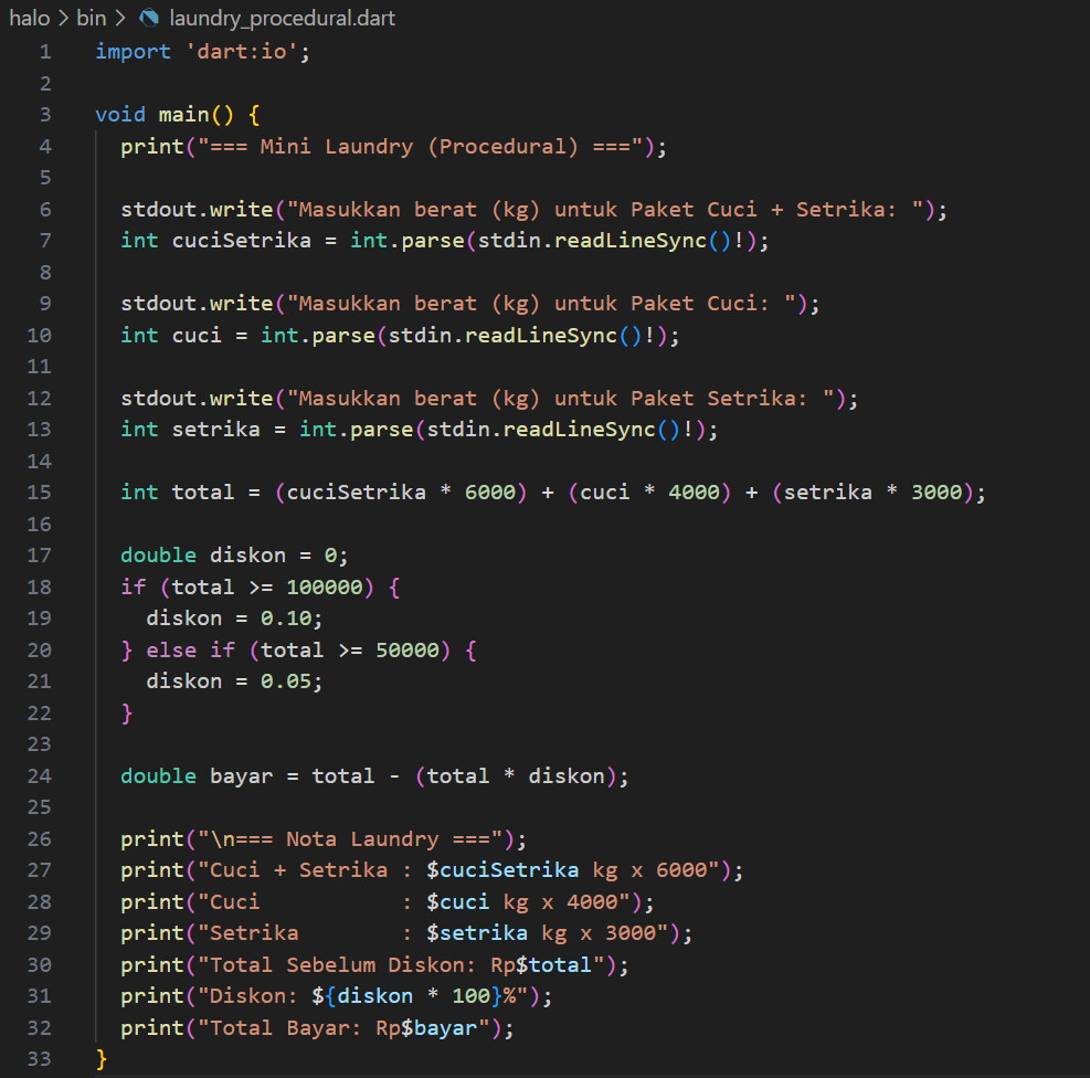 - Dart dengan ketentuan sebagai berikut : – Paket Cuci dan Setrika 1 kg 6.000 – Paket Cuci 1 kg 4.000 – Paket Setrika 1 kg 3.000 – Jika total laundry >= 50.000 maka mendapatkan potongan harga 5%, dan