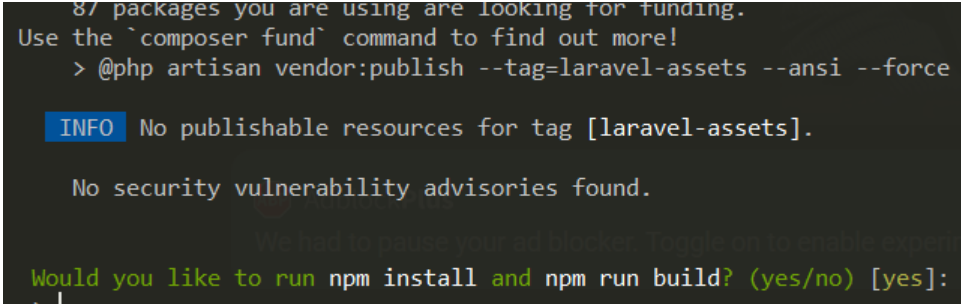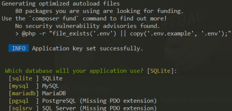 Setelah kunci aplikasi berhasil, database pertama yang digunakan adalah MySQL, dan setelah database dibuat, lakukan instalasi npm dan npm run build.