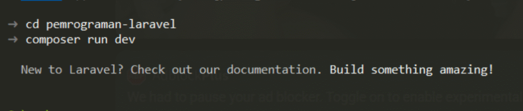 Langkah berikutnya, kita akan menjalankan proyek Laravel yang telah kita buat. Untuk melakukannya, buka proyek menggunakan editor kode seperti vscode, lalu jalankan di terminal dengan perintah berikut: