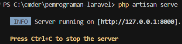 Untuk menjalankan project Laravel yang telah dibuat, gunakan perintah php artisan