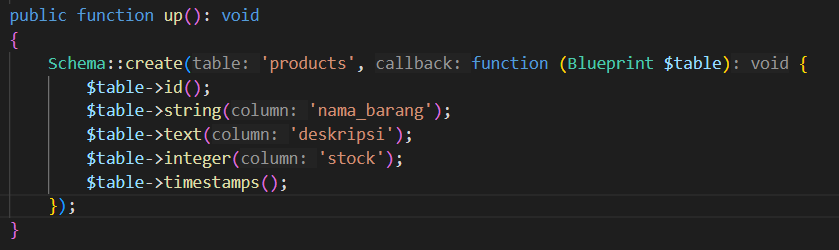 Buatlah sebuah migration dengan menggunakan kode berikut: