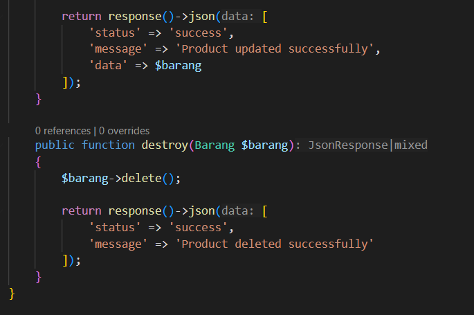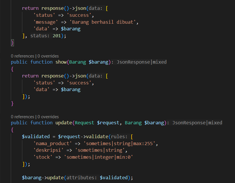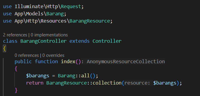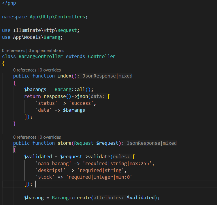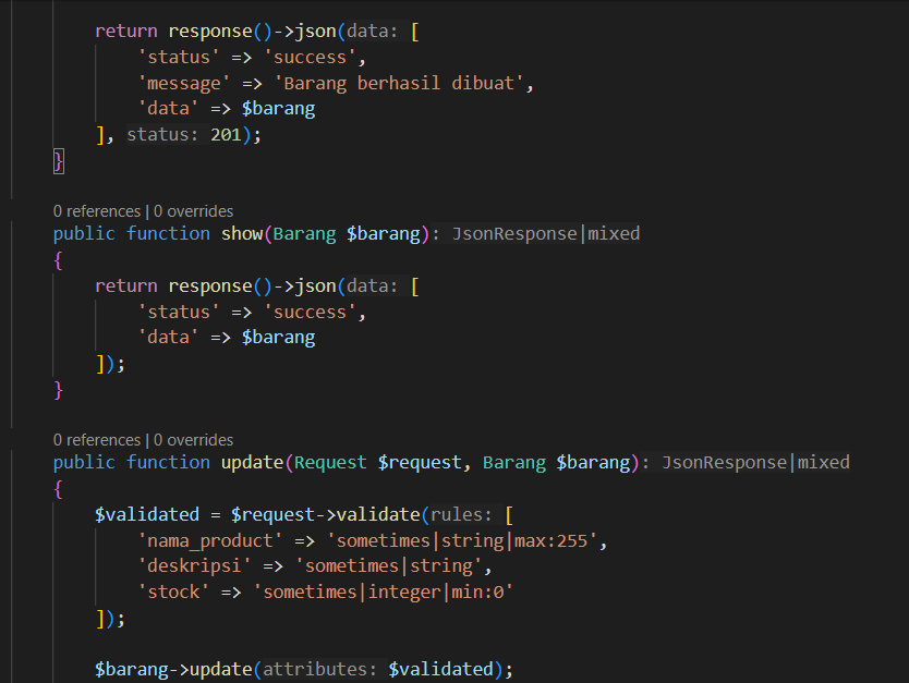 Setelah itu, masukkan kode berikut di BarangControler.php