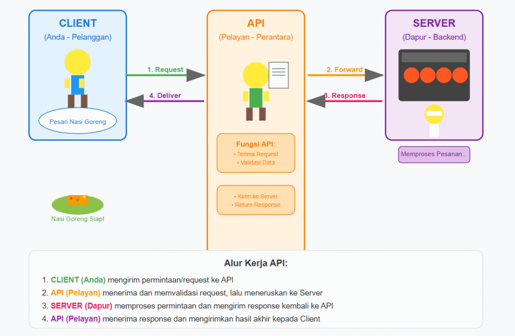 Kemudian, server (bagian backend) menangani pesanan tersebut—mengolah data atau berinteraksi dengan basis data—sama seperti koki menyiapkan nasi goreng. Setelah proses selesai, server mengirimkan hasil atau data (response) kembali ke API. Akhirnya, API menerima response tersebut, mungkin menyesuaikan format atau menambahkan informasi tambahan, lalu menyampaikan hasil akhirnya ke klien. Dengan cara ini, klien bisa mendapatkan data atau hasil aksi tanpa tahu bagaimana server memprosesnya secara detail—semuanya diurus secara transparan oleh API sebagai “pelayan”.