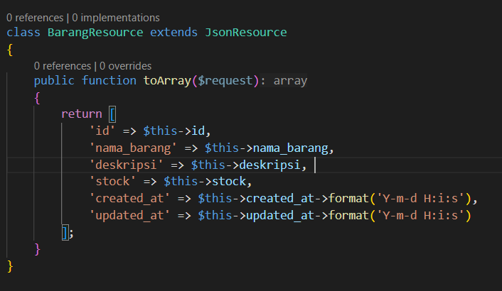 Selanjutnya, kita akan membuat API Resource. Fitur yang memungkinkan untuk mentransformasi model data atau collection menjadi format JSON yang konsisten dan mudah dikustomisasi untuk API response. API Resource berfungsi sebagai layer transformasi antara model Eloquent dan JSON response yang dikirim ke client sehingga dapat digunakan untuk Mengontrol format output JSON, Menyembunyikan field sensitive, Menambahkan field computed dan Membuat response yang konsisten.