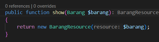 Untuk menggunakan resource yang telah dibuat di controller, ubah function index() dan show() di ProductController seperti berikut:
