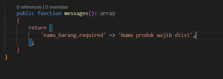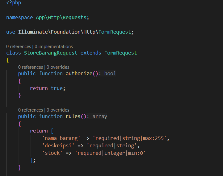 Lalu, buatlah folder Requests di app/Http, lalu masukkan kode berikut di file app/Http/Requests/StoreBarangRequest.php