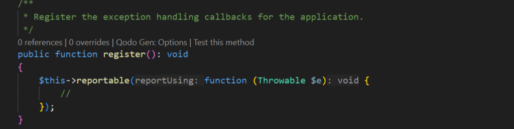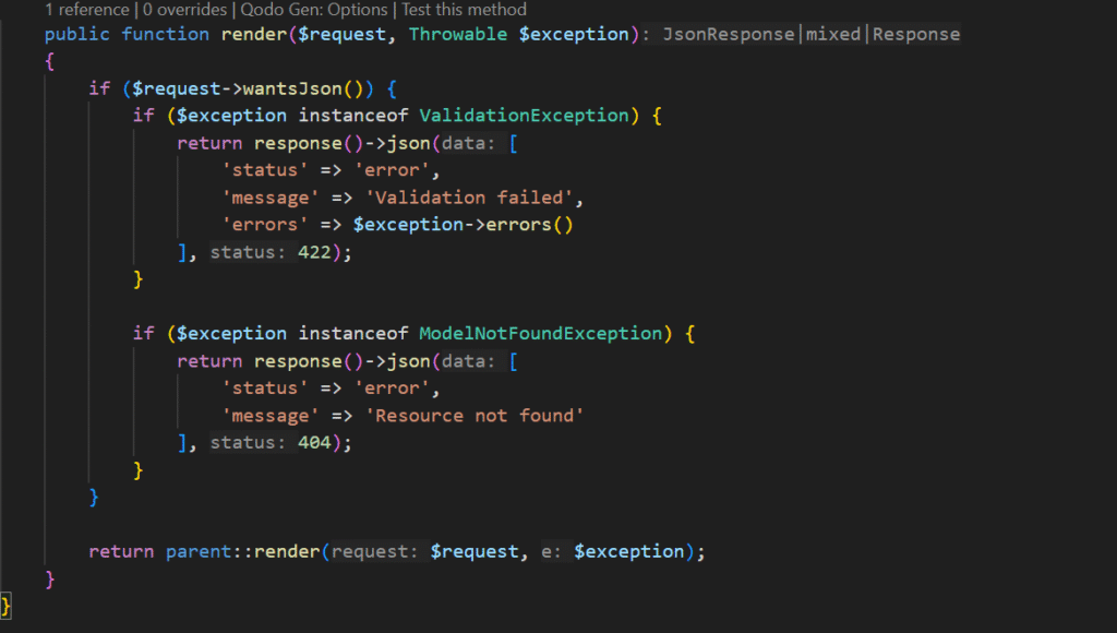 Lalu, buat file di Exceptions/Handler.php, kemudian tambahkan kode berikut di app/Exceptions/Handler.php untuk menangani Exception: