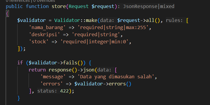 Jika ingin mendapkan exception handling tersebut, masukkan kode berikut di store() controller
